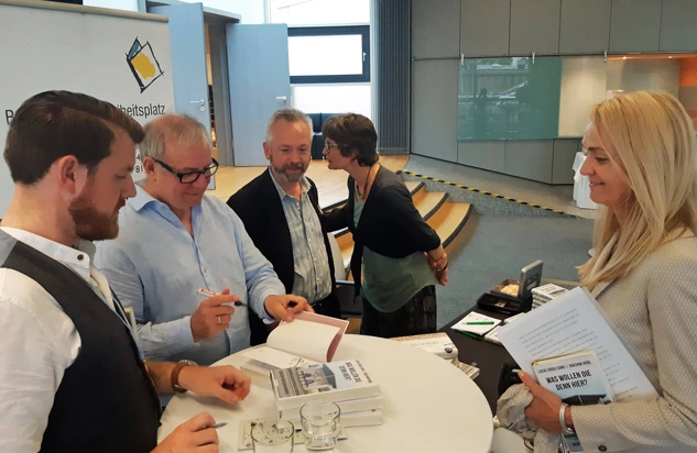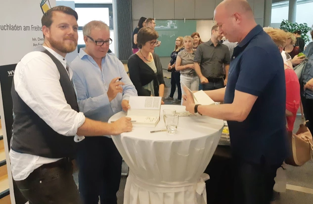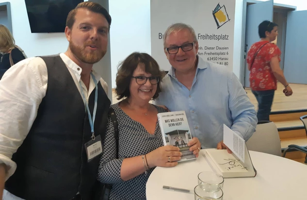 Die freuten sich mit tosendem Applaus hörbar über das Autorenteam Lucas Vogelsang und Joachim Kròl im Industriepark. Im Gepäck hatten die beiden ihren aktuellen Spiegelbestseller „Was wollen die denn hier?“. Einen Erzählband über deutsche Grenzerfahrungen. In diesem Werk haben sich die beiden Autoren intensiv mit den hartnäckigsten aller Grenzen beschäftigt – denen in unseren Köpfen. Mit diesem Thema sind sie auf der Höhe der Zeit, denn dort liegen Herausforderungen, denen sich unsere Gesellschaft stellen muss!