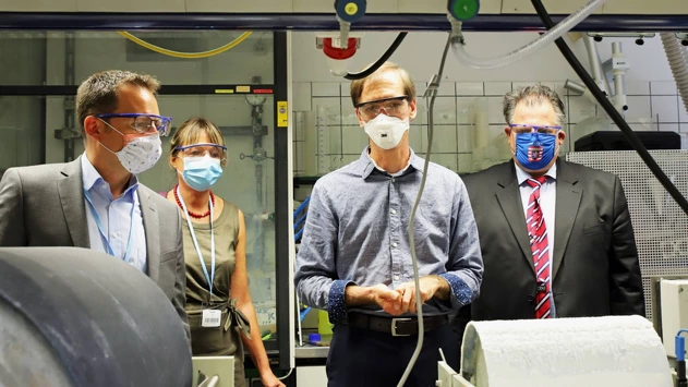 Anschließend besuchte die Delegation die Verfahrenstechnik. Hier ließen sie sich von Patrik Stenner erläutern, wie er daran arbeitet, Mikropartikel aus Abwasser mittels einer Walze und eines elektrochemischen Vorgangs abzuscheiden. „Wir schalten die Walze als Anode, die darunter befindliche Wanne fungiert als Kathode. Das Abwasser wird der Wanne zugefügt, darüber dreht sich langsam die Walze. Die Polymer-Partikel wandern zur anodisch geschalteten Walze und bleiben durch eine elektrochemische Reaktion daran kleben. Die an der Walze abgeschiedenen Partikel können mittels eines Abschabers entfernt und anschließend recycelt werden.“