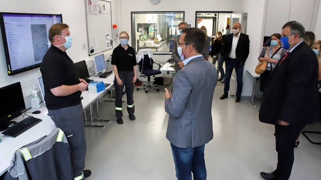Die Ausbildung war im Anschluss der Gespräche auch das erste Besuchshighlight. Die Chemikanten-Azubis Hendrik Dollar und Vanessa Schmidt stellten das Ausbildungstechnikum vor, dass vor kurzem im Rahmen einer Digitalisierungsoffensive modernisiert wurde. „Das Technikum bietet alle Funktionalitäten, die auch eine Produktionsanlage aufweist. Wir haben hier auch ein modernes Prozessleitsystem eingebaut, so dass die Ausbildungsanlage analog zu den Kundenanlagen funktioniert“, erläutert Ausbilderin Birgit Pfaff.
