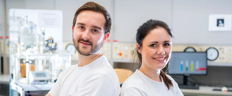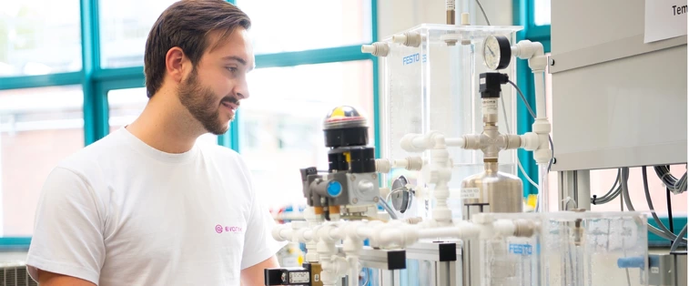Es ist kurz vor Feierabend. Lea Debes und Niclas Beier kommen gerade aus einem Workshop zum Thema Mess- und Regeltechnik. Was die beiden 20-Jährigen bei Evonik lernen, geht über das reine Verständnis von Stromstärke, Spannung und Schaltkreisen hinaus. Am besten macht das ein Beispiel deutlich. Debes steht in der Ausbildungswerkstatt und deutet auf eine kühlschrankgroße Konstruktion aus vielen Rohren und zwei Wasserbecken. Au- ßerdem jede Menge Technik: Pumpen, Thermostate und Sensoren. „Wir haben heute den ganzen Tag an dieser Miniatur-Anlage gearbeitet“, resümiert sie den Lehrgang, den sie gerade besuchen. „Daran trainieren wir, was wir später an großen Chemieanlagen können müssen.“ Die meisten Prozesse in so einer Chemieanlage laufen vollautomatisiert ab. Messfühler überwachen den Druck, erfassen die Temperatur oder prüfen Füllstände. Der Computer bringt die Daten zusammen und steuert die Anlage.