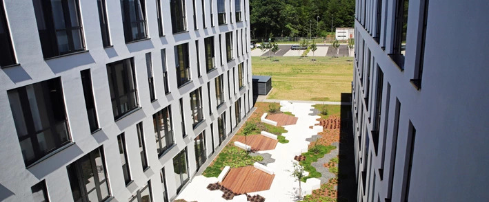 Modernes Exterieur: Der innovative Neubau glänzt mit attraktiver Hofgestaltung.