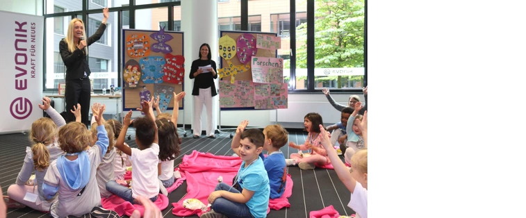 Mit den Young-Spirit-Paten Saskia Kirschner, Christine Staiger und Patrick Peters konnten sie anschließend auch direkt vor Ort weiterforschen. Die beiden Evonik-Mitarbeiter hatten ein kleines Experiment für die Kinder vorbereitet, bevor es für alle kleinen Wissenschaftler zum wohlverdienten Mittagessen ging.