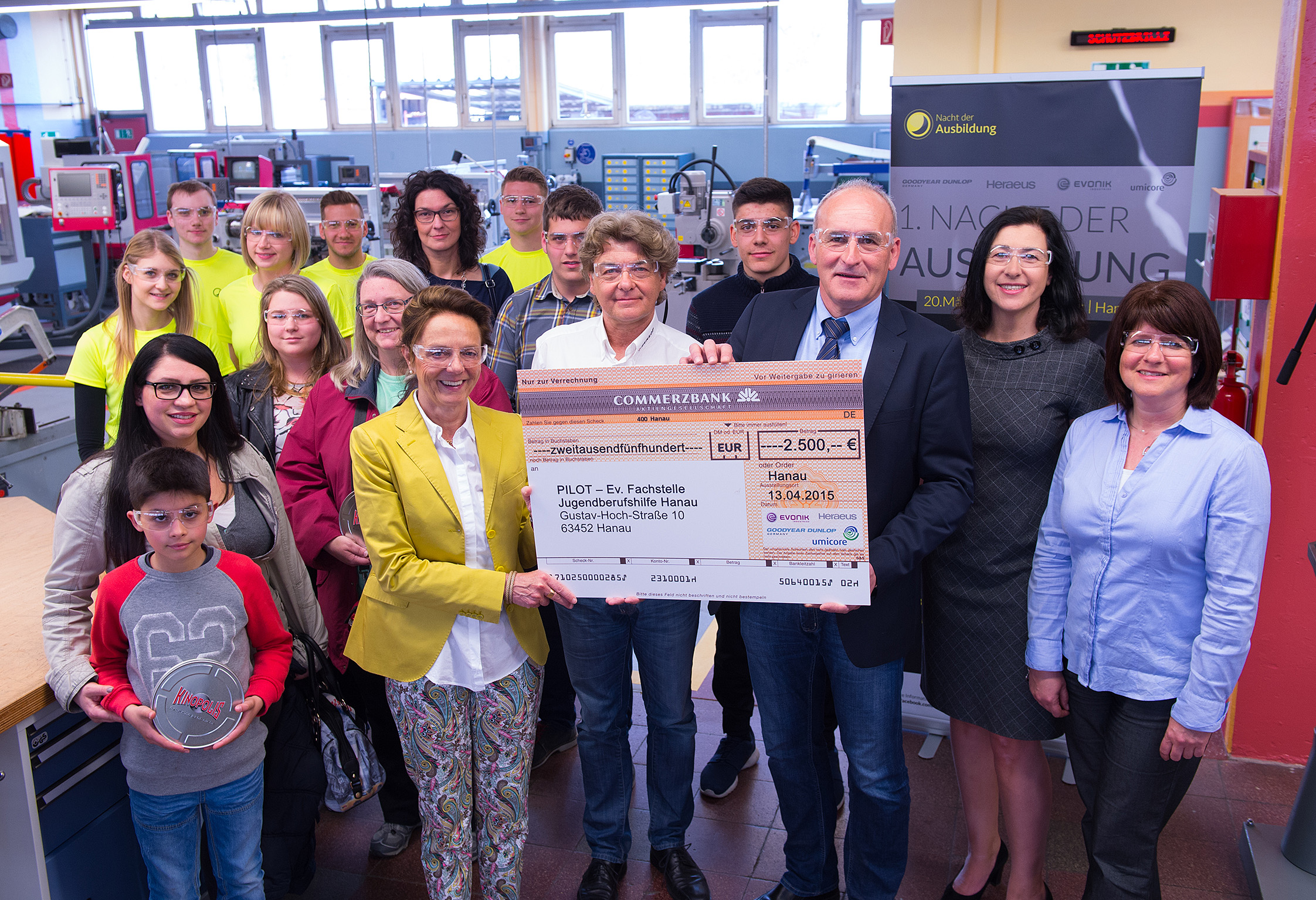 Die Unternehmen Goodyear Dunlop, Heraeus, Evonik Industries und Umicore unterstützen „Pilot“, die Evangelische Fachstelle für Jugendberufshilfe Hanau, mit einer Spende in Höhe von 2.500 €. Das Geld stammt aus dem Verkauf von Essen und Getränken während der Nacht der Ausbildung. Diese fand am 20. März 2015 in Hanau statt. 2.500 Teilnehmer besuchten die vier Unternehmen. Mit der Spende aus den Erlösen fließt so ein Euro pro Besucher in die Arbeit der Jugendberufshilfe Hanau.
