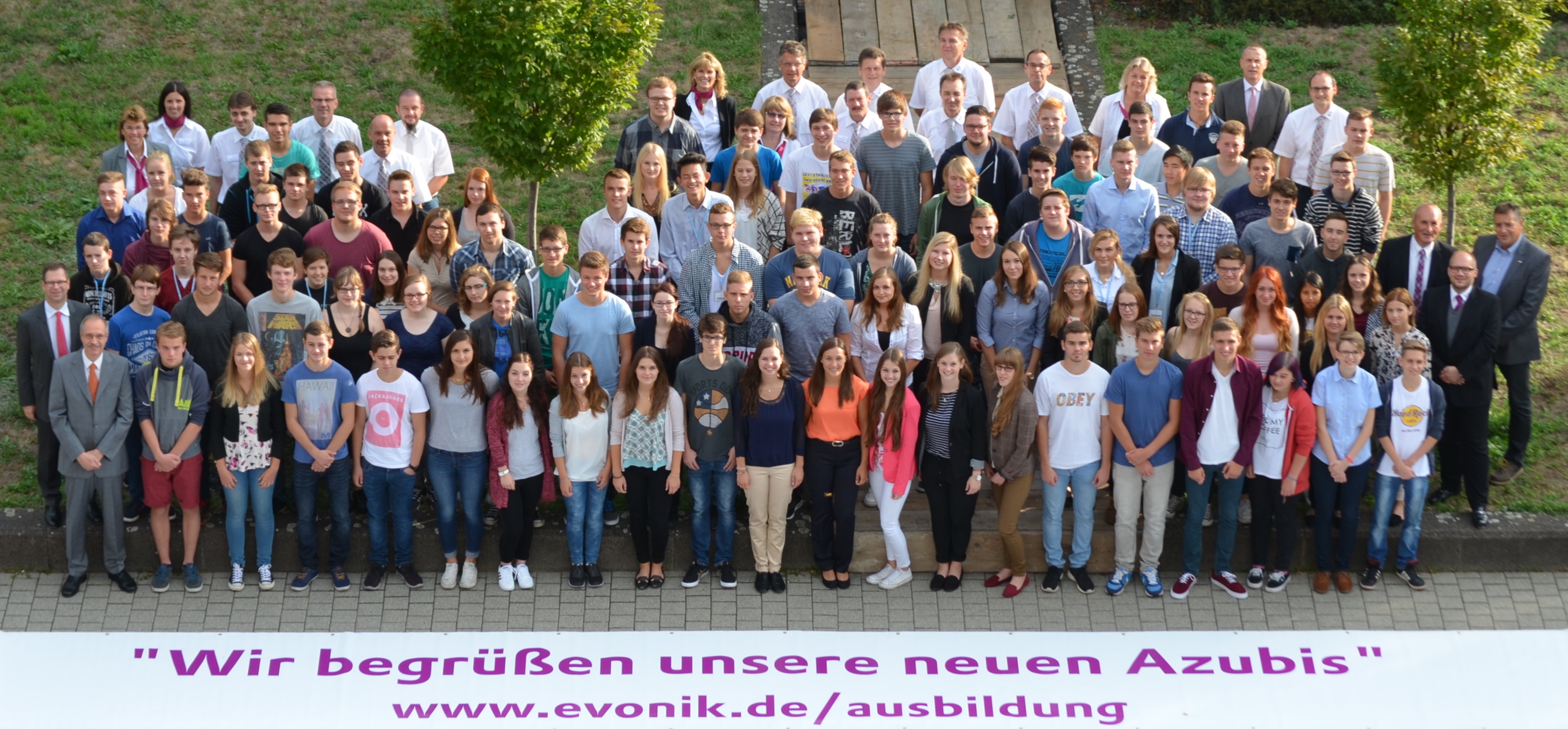 Bildunterschrift: 93 glückliche Jobstarter an ihrem ersten Tag im Industriepark Wolfgang. Foto: Evonik Industries